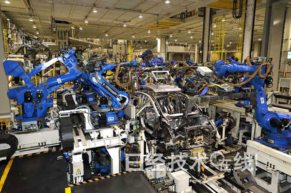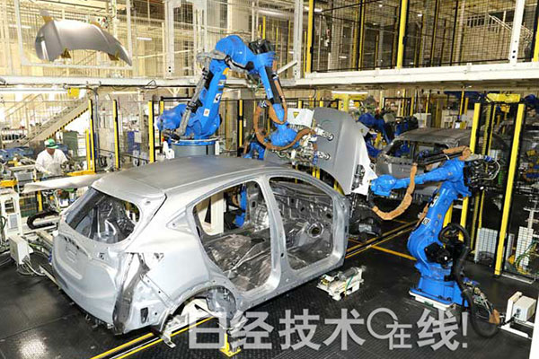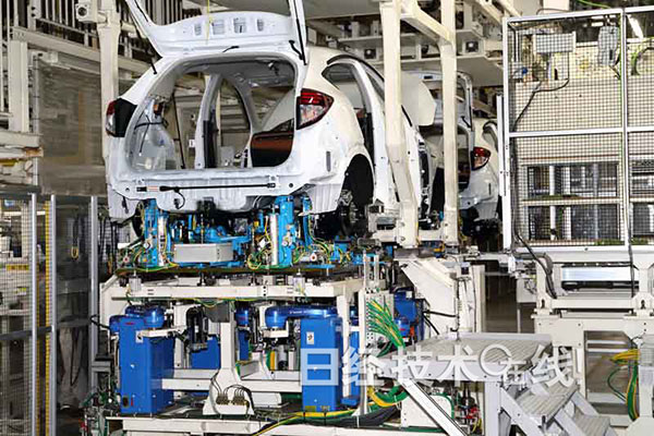 Inner GW工序 YASKAWA焊接機器人的焊接作業被設定為1臺機器人約打12個焊點,總計打126個焊點。通過在狹小空間內讓每臺機器人多打焊點,將機器人數量從16臺減少到了10臺。通過采用上述兩階段的焊接工序,可優化點焊的打點作業,減少利用MIG(Metal inert Gas)焊接及螺釘緊固手段的加固工序,從而降低成本并實現輕量化。 在接下來的組裝工序,工廠人員介紹了11處自動化工位中的部分工位。涂裝工序后的車門拆卸以及向車身組裝發動機罩等作業改用機器人來完成。并且,發動機及懸掛模塊,乃至輪胎組裝等的裝配也都實現了自動化。