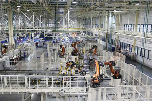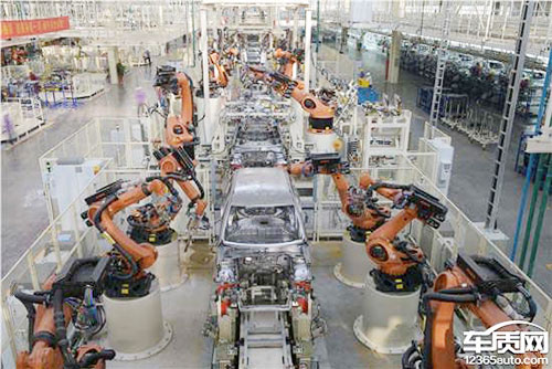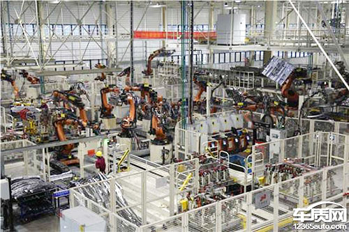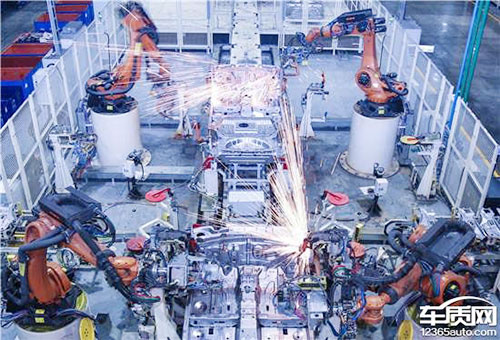 焊裝車間是一個高自動化、高生產節拍、高柔性化生的產車間,先進程度在中國品牌中名列前茅。車間里的機器人為德國著名品牌KUKA,該品牌機器人也是奔馳、大眾等車企指定品牌。車間共設6條全自動化生產線,分別為地板分拼線、側圍線、門蓋滾邊線、主焊線、調整線、空中儲運線。 地板三大件采用吊具上件,機器人自動焊接的工藝。上件完成后,工裝滑入焊接位置,機器人先進行點定焊接,再抓起工件進行空中補焊后放入下一工位,通過工裝滑入指定位置,由機器人抓入合拼工位。