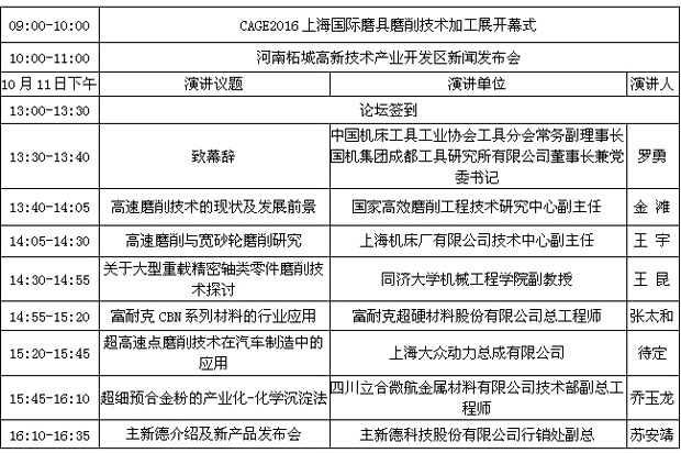 為進一步落實磨具磨削產業戰略部署,共同推動磨削產業的交流、孵化、市場推廣及技術應用。中國工具展組委會主辦的2016 CAGE上海國際磨具磨削技術研討會10月11日將在上海盛大開幕。具體日程如下: