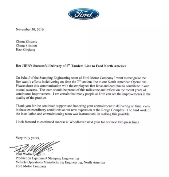 美國福特發(fā)來感謝信 來信中,美國福特對濟(jì)南二機(jī)床項目團(tuán)隊克服由于新車間同步改造給JIER沖壓線安裝帶來的不利因素,按期將產(chǎn)品交付用戶所做的努力表示感謝,對濟(jì)南二機(jī)床在產(chǎn)品質(zhì)量方面的持續(xù)提升給予贊揚。