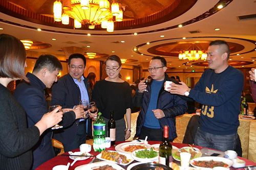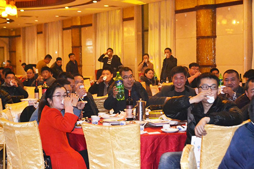 top2:晚宴聚會 與會議環節承擔的溝通學習職能不同,此次活動的晚宴環節呈現更多的是友誼和諧情。 觥籌交錯間,大家共敘友誼,飲酒調笑,為合作打下堅實基礎。 此外,為答謝從各地趕赴至此的新朋老友及展商買家,主辦方準備了價值萬元的禮品,除了人手一份的伴手禮,還設置抽獎環節,抽獎頻率一波接一波,喜得獎品的幸運兒還被要求飲下“福酒”。