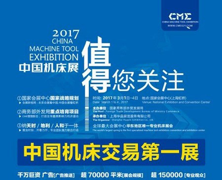 2017年3月01日—04日,第三屆中國機床展(CME2017)將于上海虹橋國家會展中心盛大開幕。屆時,來自全國各地約1000余家展商將攜帶數千套通用機床、專用機床及工業機器人等主要展品,競相展示機床工具產業發展的最新戰果。本屆展會規模將達100000平方米,較上屆增長66.7%,預計將有逾100000名專業觀眾到會參觀洽談,同比增長87%。