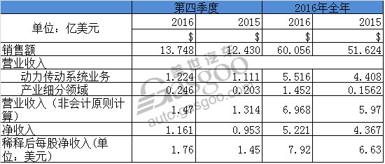 蓋世汽車訊 據利納馬官方發布的數據顯示,其2016年銷售額再創新紀錄,呈現出兩位數的增長。 2016年財收亮點 2016年銷售額同比增長16%,達到60億美元;營業收入同比增長17%,達到6.968億美元;凈收入同比增長20%,達到5.221億美元,而稀釋后每股收益同比增長20%,達到7.92美元;動力傳動系統業務創下的營業收入同比攀升25%,達到5.516億美元,而銷售額同比增長也達到19%。 第四季度營收亮點 2016年第四季度的銷售額為13.748億美元,與2015年同期(12.43億 美元)相比增長1.318億美元; 第四季度,動力傳動系統業務的銷售額同比增長了1.296億美元,銷售額的增長主要來源于2016年第一季度收購Montupet公司,并且在亞洲和歐洲又發布了新的項目,從而在一定程度上抵消了部分汽車業務產量下滑以及北美和歐洲地區商務車業務銷售額下滑產生的損失; 在工業細分領域,利納馬第四季度的銷售額同比增長1.5%,達到1.447億 美元; 2016年第四季度,利納馬的營業收入為1.47億美元,與2015年同期(1.314億美元)相比增長0.156億美元; 此外,利納馬第四季度動力傳動系統的營業收入與2015年同期相比增長了1130萬美元。