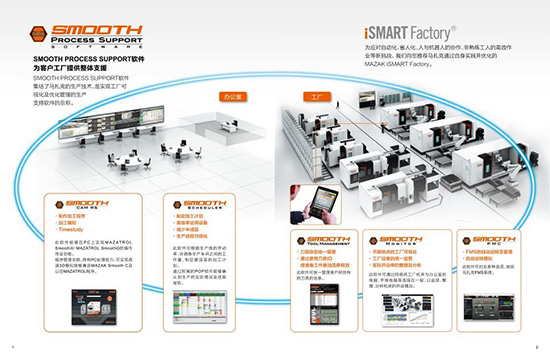 馬扎克i Smart Factor結合最新的信息通信技術和數控技術,采用了最新的軟件信息系統,從產品銷售、設計、制造、運維等全過程滿足客戶個性化需要。利用SMOOTH PROCESS SUPPORT智能化工廠管理軟件,實時掌握生產動態,可以通過軟件將信息技術用于產品設計、制造以及管理等全生命周期中,使得工藝、程序、計劃等生產準備提前展開。從產能設計到制造,柔性化的生產線支撐,實現多品種產品生產的動態配置資源,助力實現工業4.0。