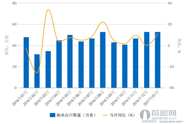 據前瞻數據庫數據顯示,2017年1月我國軸承出口53450萬套,當月同比增長11%。 以下為2016年1月—2017年1月我國軸承出口數量統計:
