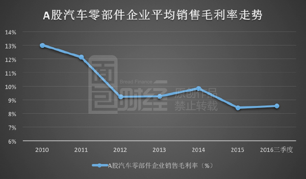 根據主要上市公司的財報數據統計,平均毛利率已連續兩年低于9%。國產零部件企業的困境,一部分原因是受到合資車企的排斥。 外資、合資品牌乘用車在中國汽車市場大行其道,這種狀況導致大部分國產零部件企業被排斥在外資、合資車系的整車配套市場之外。據估算,外資企業占據轎車零部件的市場份額高達80%以上,遠高于整車的市場占有率。更值得關注的是,由于頻頻遭到國外反傾銷調查,國產零部件的出口額也已出現了兩連跌。 國產零部件困境:銷售毛利率持續走低 一汽富維主營業務為車輪、保險杠和車燈業務。2016年其銷售毛利率僅為6.54%;其中,汽車車輪的毛利率更是只有1.82%。 不只是一汽富維,目前在A股上市的46家汽車零部件企業(2010年之前上市)的平均銷售毛利率正持續走低。2016年前三季度,A股46家汽車零部件企業的平均銷售毛利率僅為8.58%,與2010年相比,跌幅達4.46個百分點。下圖為面包財經根據申萬行業類中的汽車零部件行業繪制的46家A股上市公司平均銷售毛利率(總毛利/總營收)走勢: