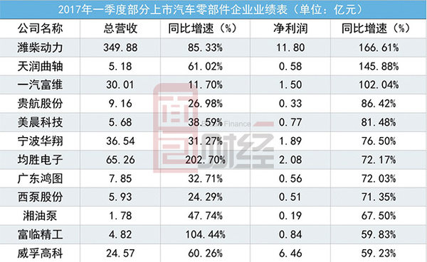 但中國核心汽車零部件行業,大部分卻被外資掌控。據調查,目前合資整車廠的一級供應商中90%以上是外資或合資零部件企業。不僅是外資、合資品牌車,就連自主品牌車的部分核心零部件也大都來自外資企業。 不過,近年來,多家汽車零部件企業業績增速迅猛,洶涌的海外并購熱潮正在汽車零部件行業日益澎湃。據統計,自2013年以來,中國零部件企業在海外并購的花費超過140億美元,折合人民幣超過千億元。這其中已經誕生了漲幅超過300%的大牛股。 今年前4月,中國乘用車銷量增速已下降到不足2.5%;汽車銷量高增長時代正逐漸結束,但在汽車零部件深度國產替代的背景下,中國的汽車零部件行業或許將產生新的巨無霸。 汽車零部件企業業績不俗:多家企業利潤創新高 多家港股上市的汽車零部件公司業績都創下了記錄。 德昌電機(0179.HK)是一家電動電機、動力子系統及相關機電部件的汽車零部件制造商,2017財年,其汽車相關產品的銷售占比為78%。2017財年(2016年3月底—2017年3月底),總營收為27.76億美元,同比上漲24%;凈利潤為2.38億美元,同比上漲38%。 主營汽車轉向系統和傳動系統的耐世特(1316.HK),2016年凈利潤為2.94億美元,同比大漲43.47%。 多家在A股上市的汽車零部件企業近期業績也表現不俗。下表為面包財經列出的2017年一季度部分上市汽車零部件企業業績表: