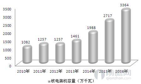 一、核電設備領域需求情況 1、核電裝機容量發展現狀 單就核電裝機容量的變動情況來看: 整體上我國的核電裝機容量逐年上漲,并且增速較快,近年來核電在電力結構中的占比有所上漲,在電源結構中占據越來越重要的地位。 截止到2016年底全國核電裝機3364萬千瓦,同比增長23.80%;發電量2132億千瓦時,同比增長24.40%;設備平均利用小時7042小時,同比降低361小時。 圖表:2010-2016年核電行業裝機容量情況(單位:萬千瓦)