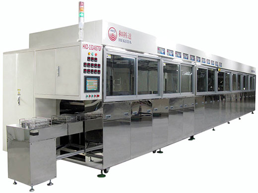超聲波系統的應用,大大提高了對精密零部件的清洗效果。和科達(AMTS 2017 展位號:E1-C20)的全自動超聲波清洗機采用了PLC全程序控制與觸摸屏操作界面,在清洗過程中實現全自動控制,并利用機械手平穩運行。其慢拉脫水工藝能有效切除平板式零件表面水漬,防止殘留水漬干燥后留下污斑。烘干方式則采用槽式或隧道式熱風烘干,配有耐高溫高效過濾器,保證烘干腔內空氣潔凈。