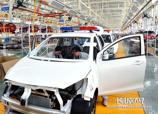 河北新宇宙電動車有限公司員工在組裝生產新能源汽車。 河北躍迪新能源科技集團有限公司是一家大型專業從事新能源汽車研發、生產和銷售的現代化國家高新技術企業,建成了汽車沖壓、焊接、涂裝、總裝和綜合檢測為一體的現代化汽車生產線。目前,該集團下屬的河北新宇宙電動車有限公司年新能源汽車產能達13萬輛,全程采用機器人全自動化生產線,在行業內處于領先水平,平均每3分鐘生產一輛電動汽車。目前,河北躍迪集團擁有專利100余項,特種設備生產許可證3項,并通過ISO9001質量體系認證。