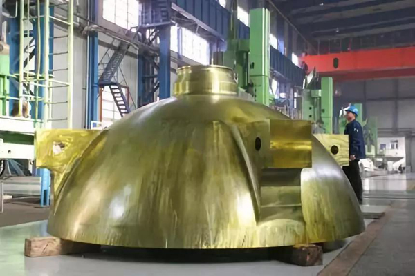 車間現代化和自動化程度很高,需要的操作工人并不多,只能看到幾個工人在操作機床。車間中部是一個大型控制平臺。繼續往里走,能發現更多支承輥,有的還在打磨,有的已經包裝好,等待發運。孫波說,車間一年能生產支承輥1200件左右,占國內市場需求的80%,還出口到印度、韓國。 與支承輥相比,中國一重生產的另一個“大塊頭”產品叫“水室封頭”,質量要求更嚴,技術也更先進。從外形看,像一個直徑約4米的半圓球,圓球上長著三個向上的角,圓球表面涂了一層防銹的金色物質。