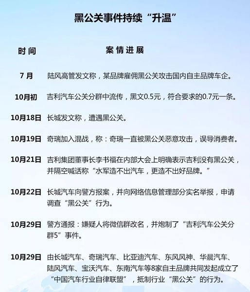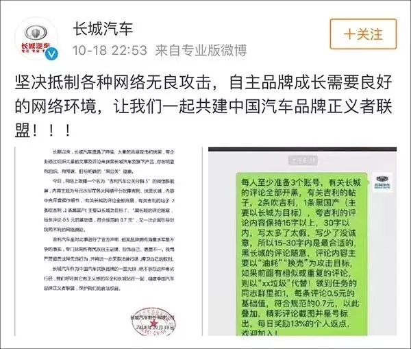 就在轟動一時的“黑公關(guān)”事件告一段落時,10月18日,長城汽車在其以分公司長城汽車股份有限公司徐水哈弗銷售分公司名義注冊的新浪微博上發(fā)布聲明稱,“吉利汽車雖對此事進行了官方聲明,但某品牌擁有海量水軍是不爭的事實,專門抹黑所有民族自主品牌、粉飾自己、表里不一”。