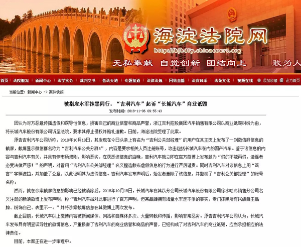 近日,浙江吉利控股集團汽車銷售有限公司以商業(yè)詆毀糾紛為由,起訴長城汽車股份有限公司,要求其停止侵權(quán)并賠禮道歉。日前,海淀法院受理了此案。