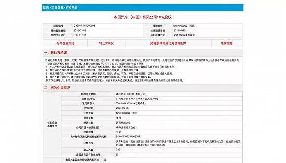 1月2日,上海聯合產權交易所在其官網上發布《本田汽車(中國)有限公司10%股權》的產權項目信心。根據公告稱,東風汽車集團股份有限公司將從即日起至2018年1月29日,掛牌出售本田汽車(中國)有限公司的10%股權,掛牌價為9487.009萬元。根據上海聯合產權交易所公布的標的企業股權結構顯示,10%是東風汽車集團股份有限公司所持有的本田汽車(中國)有限公司的全部股份,此次為期一個月的掛牌出售意味著東風汽車將從本田汽車(中國)有限公司的股東名單中徹底消失。 上個月,廣州汽車集團股份有限公司式審議通過了《關于轉讓本田(中國)25%股權及廣汽本田收購重組本田(中國)方案的議案》,批準廣汽本田汽車有限公司收購本田汽車(中國)有限公司100%股權,項目計劃總投資12.06億元。 根據官方公布的資料顯示,廣州汽車集團股份有限公司董事會同意將本公司所持有的本田汽車(中國)有限公司25%股權通過公開市場對外轉讓,掛牌轉讓底價約為23,159.3萬元,具體根據經備案的資產評估報告結果為依據確定。同意在獲得相關部門審批通過后,批準本公司合營企業廣汽本田汽車有限公司通過公開市場受讓及協議受讓收購本田汽車(中國)有限公司100%股權,并進行改造升級。