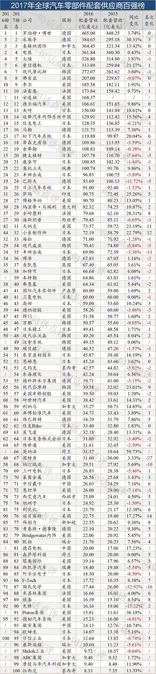 研究德納提供的資料發現,兩家世界級百年企業之間在相關業務進行整合后,新德納將超越博格華納、大陸、采埃孚,成為輕型車、商用車和非公路用車傳動系統的領跑者,2017年估計總銷售額可達到134億美元。2016年時德納銷售額為58.6億美元,相當于交易后預估銷售額的四成。通過一次合并交易,德納將銷售額提升了1.3倍,形成優勢更為明顯的規模效應。 而按照這一銷售額,德納2017年在統計的全球零部件百強榜中的名次將大幅上升。2016年百強榜中,135億美元可使企業進入前二十強中。而當年德納排名第44名,吉凱恩位列第37名。