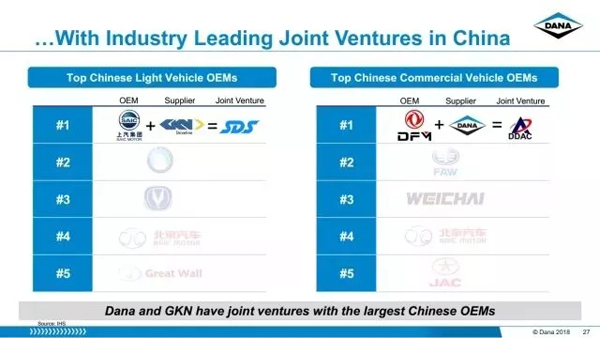 從整車客戶分布而言,德納因為源頭同福特的關聯,最大客戶為福特,但與大眾、寶馬、戴姆勒等歐洲車企的業務往來較少;吉凱恩則有11%業務來自大眾,能夠為德納補上歐洲業務的短板。 新巨頭在中國市場的表現也將更為突出。根據掌握的數據,德納原先在華業務年收入為13億美元,與吉凱恩合并后將達到26億美元,恰好翻倍。德納目前國內組建了合資公司的大客戶主要是東風、一汽、濰柴、北汽和江淮等;吉凱恩主要客戶有上汽、吉利、長安和長城等。
