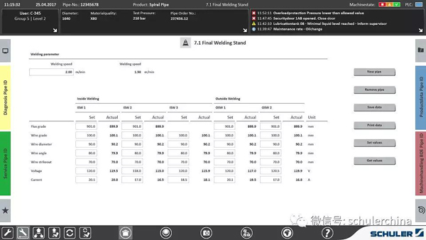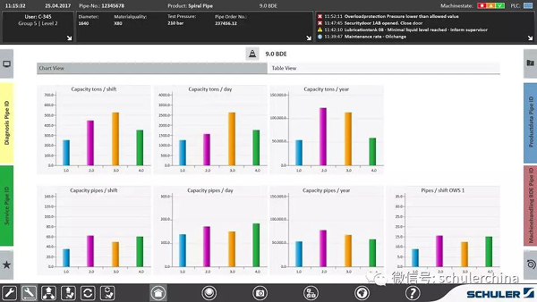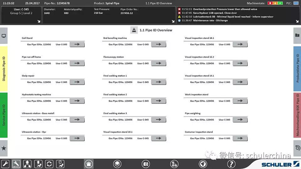 圖2:它具有追蹤與跟蹤、綜合設備效率 (OEE) 監控、條件監控、智能診斷以及能耗監控等功能 對于大口徑鋼管來說,產品數據采集尤為重要,尤其是根據 API 5L 標準,采用超聲波、靜水壓測試和 X 射線對高等級鋼管 (X100) 的尺寸或焊接質量進行檢測時更是如此。舒勒將過去的模擬X 射線系統升級為數字X 射線系統,這樣可以更加便捷地與 Pipe ID 4.0 進行整合。系統包含了一臺工作站服務器,用來存儲測試結果以及所有其他設備參數。 借助網絡標簽打印機或噴印設備與條形碼掃描儀,可以對工廠內的所有鋼管進行追蹤和跟蹤,保證其精密公差和卓越品質。在數據庫中,還可以對卷料存儲區進行管理,卷料數據將與所加工的鋼管進行關聯。平板電腦、智能手機等移動設備也可用于監控與評估。 配有 ERP 接口的光纖網絡 工作站服務器也是光纖網絡的重要組成部分,所有設備通過工業交換機進行聯機。這樣,就可以對整個工作流程進行查看,包括單臺設備的狀況、各工位的運行與故障的總體情況、單個鋼管的生產時間以及故障報告。同時,還集成了客戶 ERP 網絡的接口。 工廠中可授權 50 個操作員終端訪問有關實際工作時間、每個單位時間加工的鋼管數量、生產速度、工廠狀態以及工位(如離線焊接臺、靜水壓測試設備、交叉焊縫與修復臺、檢查臺與鋼管端面坡口機)錯誤消息等信息。這樣可以減少操作工作量,降低維護與維修成本。