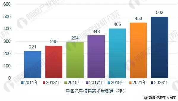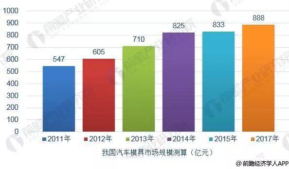 根據(jù)前瞻產(chǎn)業(yè)研究院發(fā)布的《2018-2023年中國汽車模具行業(yè)產(chǎn)銷需求預(yù)測與轉(zhuǎn)型升級分析報告》測算,汽車模具占模具行業(yè)的市場份額約1/3,而根據(jù)國家統(tǒng)計局的統(tǒng)計數(shù)據(jù),2017年我國汽車模具的銷售收入為2663.42億元,據(jù)此測算2017年中國汽車模具市場規(guī)模達(dá)到888億元。到2023年,中國汽車產(chǎn)量將達(dá)到近4182萬輛,年均增速在6.0%左右,而對于汽車模具的需求將達(dá)到500噸左右。