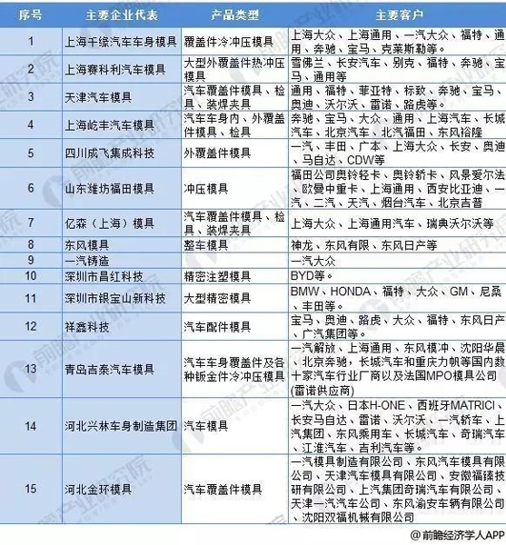 圖表4:我國汽車模具代表企業(yè)產(chǎn)品及客戶介紹(部分)