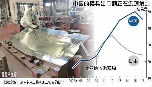 OGIHARA以前的館林工廠,現為比亞迪旗下的館林模具公司(3月12日) 2009~2010年,“OGIHARA 沖擊”襲擊了日本模具產業。當時被稱為“日本三巨頭”之一的大型模具企業OGIHARA(荻原)被并入外資系汽車零部件制造商泰國頂點集團(Thai Summit Group)和中國比亞迪(BYD)的旗下。 OGIHARA是汽車沖壓模具的最大制造商,與日本國內外的汽車廠商均具有深厚關系。3月12日,日本經濟新聞記者前往比亞迪旗下的館林模具企業,機械聲一直響個不停。公告板上貼著中國國內比亞迪整車和模具的據點地圖。在聚集了全部工序的廠房內,作業員正在不停地忙碌著。 中國模具出口額增至日本的近2倍實現高品質模具的自產化——比亞迪的意圖很清晰。負責人回顧稱,當時的比亞迪為了擺脫山寨企業的形象,需要技術實力。收購之后的1年內,館林工廠停止向比亞迪以外的企業供貨,工廠內也很冷清。 當時,中日的技術差距一目了然。“車身坑坑洼洼,讓人懷疑這車能不能賣出去”,OGIHARA的相關人士到中國的比亞迪考察的時候,稱比亞迪仍未達到世界通用品質。車身的模具加工如果不以1微米(微米為100萬分之1米)為單位,將直接導致外觀不良。中國企業開始競相追求日本的技術。 比亞迪行動迅速,僅在2010~2011年的1年內,就將數十名模具研修生派到了館林工廠。研修生學習了模具的基礎知識和現場作業等。日本技術人員也前往中國的模具工廠,長期駐在吸收技術。 國際專用工裝和加工協會(ISTMA)的數據顯示,2016年中國模具的出口金額為45億美元。2012年前后超過日本,如今成為世界最大的模具出口國。規模達到日本的近2倍,全球份額達到26%。在最近10年里,中日形勢完全逆轉,日本的技術優勢開始迅速減弱。 日本經濟新聞2~3月以415家日本模具工業協會的會員企業為對象實施了第17次“有關模具行業的問卷調查”。調查通過郵送,從相當于36.4%的151家企業獲得了回答。回答企業的34.3%認為中國企業是“威脅”。如果加上“今后是威脅”的選項,比例則高達72%。對于日本國內需求萎縮、盈利環境也很嚴峻的日本模具企業來說,迅速擴大出口的中國企業將超出競爭對手的范疇。