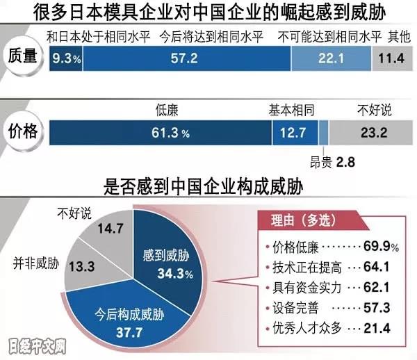 比亞迪在中國的純電動汽車市場掌握20%以上的最大份額,還向歐洲出口。目前,加上中國的2座工廠,比亞迪共有3個模具生產基地。從大約2年前開始,以往在日本制造的車身側圍大型模具改在中國生產。比亞迪消化了OGIHARA的模具技術,實現了快速增長。 比亞迪還從德國和日本等招募了大量的海外人才。以收購OGIHARA為契機,向海外敞開了門戶,2011年比亞迪與德國戴姆勒成立合資企業,學習著技術,已經不能再諷刺比亞迪是“山寨企業”了。 中日力量對比發生逆轉模具問卷調查顯示,關于感到中國構成威脅的理由(可多選),64.1%的企業列舉了“模具技術正在提高”,僅次于“價格低廉”(69.9%)。認為中國制造的品質“和日本處于相同水平”的企業僅為9.3%,但另一方面,57.2%的企業認為“今后將達到相同水平”。 東京大學名譽教授、鴻海精密工業特別顧問中川威雄表示,“品質和技術實力的差距已經很小”。中川約20年前從東京大學退休之后出任了鴻海的特別顧問,一直在近距離觀察鴻海的模具技術。當時,中川威雄在鴻海的模具工廠看到“全都是最先進設備”,難掩驚訝之情。