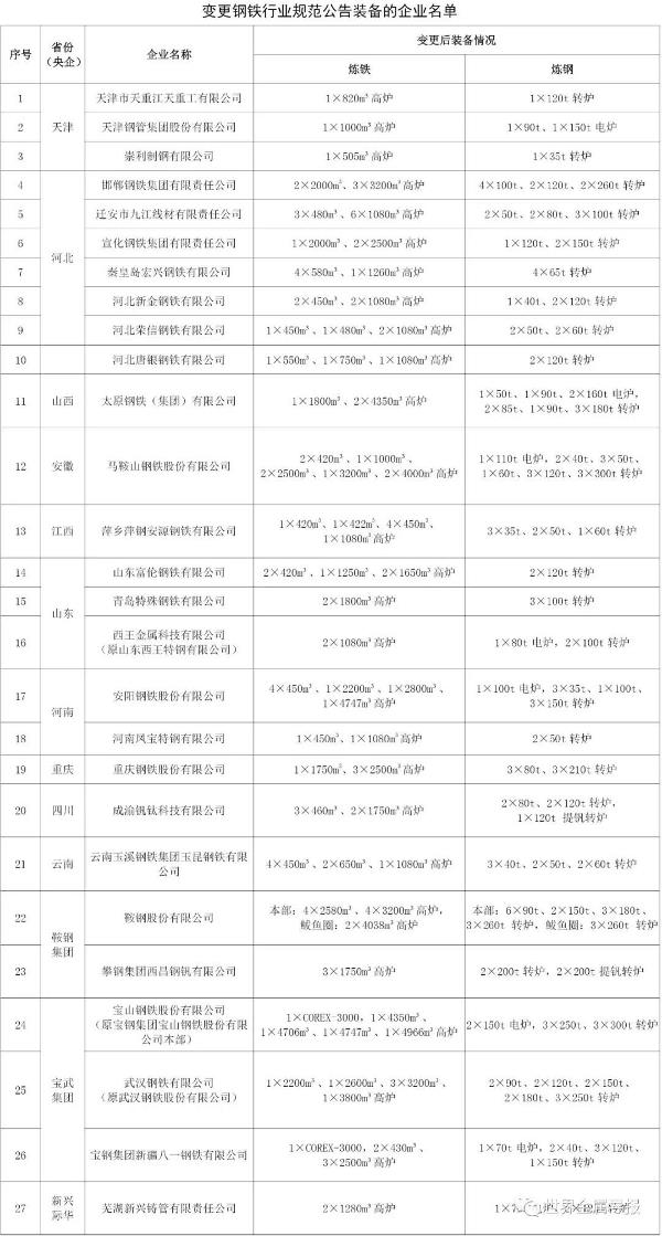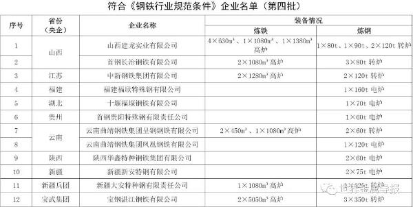 4月3日,工信部公布了符合《鋼鐵行業規范條件》企業名單(第四批)、撤銷鋼鐵行業規范公告的企業名單、需整改的鋼鐵行業規范企業名單、變更鋼鐵行業規范公告裝備的企業名單、變更鋼鐵行業規范公告名稱的企業名單。 據統計,新增的第四批符合規范條件的鋼鐵企業共計12家,撤銷規范的鋼鐵企業共計11家,需整改的鋼鐵行業規范企業共計17家,變更共計34家(變更鋼鐵行業規范公告裝備的企業27家、變更鋼鐵行業規范公告名稱的企業7家),具體名單如下。