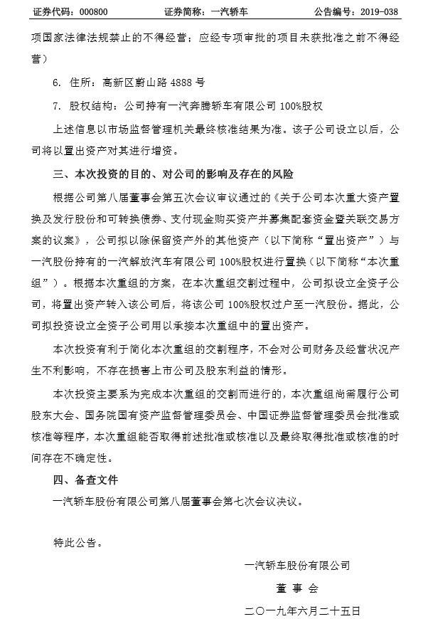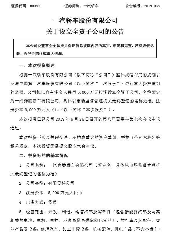 6月25日,一汽轎車股份有限公司發布“關于設立全資子公司的公告”。公告顯示,根據一汽轎車股份有限公司整體戰略布局的規劃以及與中國第一汽車股份有限公司進行重大資產重組的需要,公司擬以自有資金人民幣5000萬元投資設立全資子公司,名稱暫定為一汽奔騰轎車有限公司。