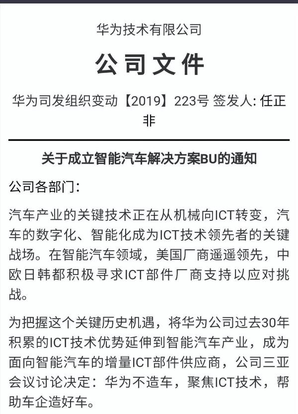 日前,由華為總裁任正非簽發(fā)的一份內(nèi)部通知文件流出。《通知》顯示,經(jīng)總裁批準(zhǔn),華為將成立智能汽車解決方案BU,隸屬于ICT管理委員會管理。