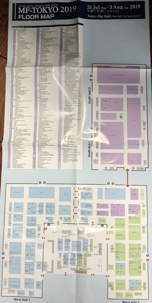 中國鍛壓協會近些年都參加了世界上涉及鍛造、沖壓、鈑金制作、模具和鉚焊相關的展覽會,2019年參加了在日本舉辦的MF-Tokyo展覽會,展覽會的時間是2019年7月31日-8月3日。展覽會占了日本 “東京國際展覽中心 TOKYO BIG SIGHT”的南面兩個館和西面兩個館,同時包含了東西兩個館的連接部位,如下圖。其中粉顏色的為鈑金制作,淺藍色的為鍛造,黃顏色的為沖壓。他們把螺釘螺帽、彈簧等標準件、緊固件的成形算作了鍛造成形。