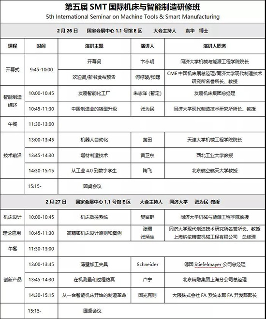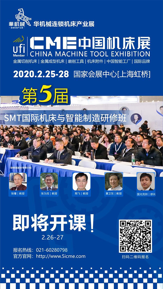 緊隨智能制造創(chuàng)新大趨勢,2020年2月26-27日 國家會(huì)展中心,在2020CME中國機(jī)床展現(xiàn)場同期舉行的第五屆SMT國際機(jī)床與智能制造研修班。本屆SMT研修班將致力聚集國內(nèi)外制造業(yè)有志之士共同將智能制造從云端概念落實(shí)到實(shí)處,在積極推進(jìn)互聯(lián)網(wǎng)+和兩化融合的進(jìn)程中,深入探討高端數(shù)控機(jī)床在智能制造中的作用,并以智能工廠建設(shè)、增材制造、工業(yè)數(shù)字化、機(jī)床數(shù)控系統(tǒng)升級等熱點(diǎn)關(guān)鍵詞進(jìn)行解讀,促進(jìn)傳統(tǒng)制造業(yè)轉(zhuǎn)型升級和可持續(xù)發(fā)展。 第五屆SMT國際機(jī)床與智能制造研修班 日期:2020年2月26-27日 地點(diǎn):國家會(huì)展中心1.1號館E區(qū)(上海虹橋) 主辦單位:同濟(jì)大學(xué)機(jī)械與能源工程學(xué)院 承辦單位:CME中國機(jī)床展