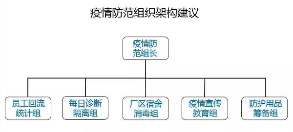 其次,復(fù)工前企業(yè)要做好下面八個準備 一、建議公司應(yīng)成立疫情防范小組 針對疫情,成立公司疫情防范小組,進行人員管控,環(huán)境消毒,疫情宣傳,物質(zhì)籌備等方面工作,確保公司所有的疫情防護措施做到位。