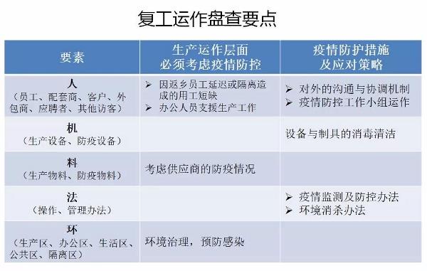 三、工廠復(fù)工運作盤點 圍繞“人機料法環(huán)”等幾個方面,對生產(chǎn)運作進行盤點,并制定相應(yīng)的應(yīng)對策略。