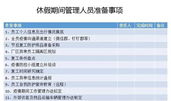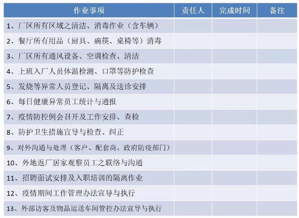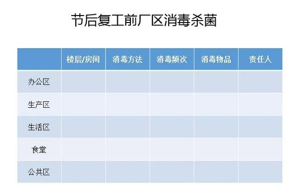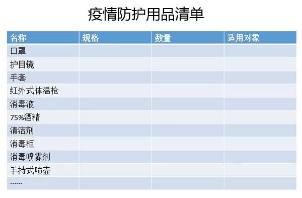 八、疫情防護用品準備清單 復(fù)工前準備好用于疫情所需的防護用品。通過以上八點對復(fù)工時間、復(fù)工前的準備,各級管理人員復(fù)工前的工作事項安排等,確保人員健康的前提下正常復(fù)工。