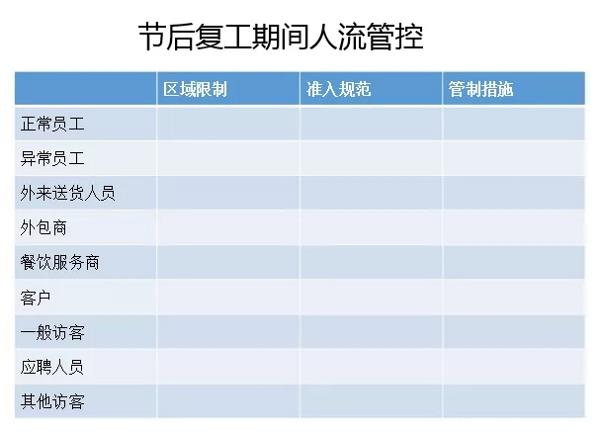 五、返廠復(fù)工人流管控措施 根據(jù)疫情區(qū)域情況,制定返廠復(fù)工人流管控方案以及復(fù)工期間人流管控措施。
