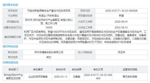 3月13日,據(jù)河南省投資項目在線審批監(jiān)管平臺消息,鄭州宇通客車股份有限公司節(jié)能與新能源客車生產(chǎn)基地沖壓車間項目審批結(jié)果顯示“已備案”。項目估算總投資16000萬元,計劃兩年完工。 據(jù)悉,項目建設(shè)地在鄭州市鄭州經(jīng)濟技術(shù)產(chǎn)業(yè)集聚區(qū)前程大街以西、南三環(huán)以南。2020年8月1日計劃開工,2022年8月1日計劃完工。