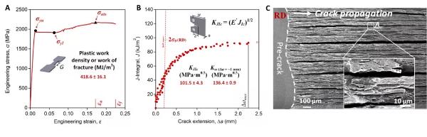 圖2(A)工程應力應變曲線 和(B)J-積分阻力曲線。展示了D&P鋼同時具有較高的屈服強度、韌性、延展性。(C)D&P鋼的斷口形貌:其斷面有大量不同尺度的晶界開裂裂紋。 在工業應用上,高端的鋼材必須具備良好的斷裂韌性,即抵抗斷裂的能力,除耐用外更重要是避免構件提前失效導致意外。一直以來,提升鋼材強度往往會降低其韌性,導致材料脆性增加,而有關的研究工作相當艱巨,因為當強度進入超高范圍時,進一步改善材料韌性的難度將以倍增。 目前,工業生產鋼材1.7GPa已屬很高的屈服強度,應用于橋梁纜索,其韌性度最高也未能超越65MPa?m½,用于裝甲運兵車等軍用鋼材,也僅在這個水平。琴弦的鋼絲,屈服強度高達2.6 - 2.9GPa以維持音準,但韌性非常低,因而容易斷裂。