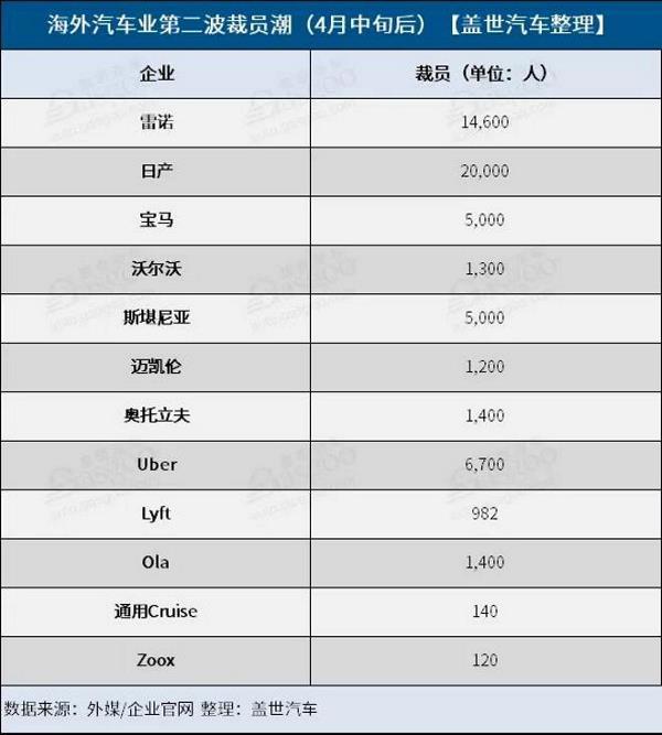車企 01雷諾:全球裁員1.46萬人 削減158億元成本 5月29日,法國汽車制造商雷諾宣布,未來三年內,將在全球范圍裁員1.46萬人。雷諾在全球共有員工18萬人,本次裁員占其員工總數的近10%。其中雷諾法國本土目前雇傭員工4.85萬人,計劃裁員4,600人。知情人士透露,雷諾希望員工自愿離職,并優先考慮與即將退休的員工解除勞動關系。與此同時,雷諾將削減20億歐元(約合人民幣158億元)運營成本,以應對疫情導致的購車需求下滑問題。 02日產:全球裁員2萬人 削減198億元成本 據日本共同社報道,日產汽車考慮在全球范圍裁員逾2萬人,這一數字約占日產全球員工總人數的15%,裁員將主要集中在歐洲和發展中國家。此外,日產還計劃將年產能削減20%至540萬輛,將全球車型陣容從當前的69款削減至55款以下,關閉巴塞羅那工廠和印尼整車廠,退出韓國并淘汰Datsun品牌等,以期實現削減3000億日元(約合人民幣198億元)的固定成本。 03寶馬:計劃裁員5,000人 據外媒報道,寶馬集團計劃削減5,000個工作崗位,可能對失業員工提供更多的離職補貼,從而鼓勵員工自愿離職。寶馬首席財務官Nicolas Peter在公司內部公告中表示,公司已無法通過現有措施(包括安排員工進行無薪休假,以及縮短合同工的工作時間等)實現裁員目標。寶馬一位發言人在5月29日表示,該公司有可能引入提前退休方案。 04沃爾沃汽車:將在瑞典裁員1,300人 據外媒報道,沃爾沃汽車將在瑞典裁減1,300名白領員工,裁員的確切數字將在未來幾個月與工會談判決定。據了解,沃爾沃汽車在瑞典擁有2.4萬名員工,其中不包括約2000名顧問。此次措施還包括繼續審查和削減咨詢合同,但不會影響其制造業務。 05斯堪尼亞:冗余5,000人 計劃大規模裁員 據外媒報道,瑞典卡車制造商斯堪尼亞正計劃進行大規模裁員。該公司估計,由于新冠病毒危機,其當前在全球擁有的員工數量比需要的要多5,000人左右。斯堪尼亞在全球擁有約51,000名員工,該公司首席執行官Henrik Henriksson表示,將對其總部約1,000個白領崗位進行評估。“我們預計市場需求要達到疫情前的水平還需要很長時間,因此我們的人員組織架構也要適應新形勢。這將是在全公司范圍內實行的措施,不排除發出正式的裁員通知。” 06邁凱倫:計劃裁員1,200人 據外媒報道,英國超級跑車制造商、一級方程式車隊擁有者邁凱倫集團將根據擬議中的重組計劃削減1,200個工作崗位。該公司當前的員工數量只有4000余人,本次裁員幅度達到了員工總數的四分之一以上。邁凱倫車隊也是今年4月份首支因疫情要求員工無薪休假的F1車隊。該車隊員工總數為800余人,預計該車隊將裁員大約70人。另外還有媒體報道稱,邁凱倫正在尋求通過抵押其沃金總部以及歷史悠久的賽車收藏,籌集高達2.75億英鎊(約3.3957億美元)的資金。 零部件供應商 01奧托立夫:裁員1,400人 受疫情影響,安全氣囊和安全帶制造商奧托立夫表示將采取措施控制成本、減少開支,并強化現金流現狀。4月,奧托立夫削減了員工總數,預計5月和6月還會進一步減少。截至3月31日,奧托立夫總員工數(包括全職員工和臨時工)較去年同期減少1,400人,至65,000人左右。與年初的計劃相比,奧托立夫今年前4個月的資本支出減少了30%以上,約為5,000萬美元。截至4月30日,奧托立夫的現金余額為14億美元。 網約車行業 01Uber:裁員6,700人 或關閉全球45個辦公室 5月6日Uber宣布,由于疫情嚴重沖擊了網約車業務,該公司將裁去3,700名全職員工,本次裁員人數占其員工總數的17%,被裁員工來自客戶支持、招聘團隊等部門。5月18日,Uber公司再次宣布裁員3000人,并將在全世界范圍內關閉45家辦公室、暫停多個非核心項目。在最新一輪裁員之后,Uber已經裁去了公司大約25%的員工。Uber發言人表示,該公司有可能在未來繼續裁員。與此同時,該公司CEO達拉·科斯羅薩西(Dara Khosrowshahi)將放棄今年剩余時間的基本工資。 02Lyft:裁員982人 288名員工無薪休假 4月29日,Lyft在一份監管文件中表示,為了在疫情期間減少支出,該公司將裁員982人,約占其員工總數的17%左右,此外還將有288名員工被迫無薪休假。除此之外,Lyft還將從5月份開始,降低員工的基本工資,降薪期將持續12周。公司高管的降薪幅度為30%,副總裁降薪20%,其他員工降薪10%。Lyft在文件中表示,在今年第二季度,其董事會成員將放棄30%的現金薪酬。 03Ola:裁員1,400人 管理層大幅降薪 據外媒報道,在過去兩個月,印度網約車企業Ola業務量下降了95%。5月20日,Ola宣布該公司將裁員1,400人,裁員將首先針對印度出行業務部門,而后是外賣配送部門和金融服務部門。被裁員工將獲得至少3個月固定薪資的補償,工齡長的員工將獲得更高補償。此外,該公司領導團隊的所有成員都將大幅降薪。Ola首席執行官Bhavish Aggarwal稱,“在本次裁員之后,公司不會再因為疫情進行裁員。” 自動駕駛行業 01通用Cruise:裁員140余人 5月14日,通用汽車旗下自動駕駛部門Cruise通知員工,該公司已經決定進行裁員,但并未公布具體的裁員人數。外媒從該公司內部文件獲悉,本次裁員約占Cruise員工總數的8%,具體人數為140余人,其中包括位于加州帕薩迪那的工程團隊,該團隊負責開發激光雷達技術。 02Zoox:裁撤120名合同工 據外媒報道,市值超30億美元的自動駕駛初創公司Zoox解雇了幾乎所有合同工,其中包括自動駕駛汽車的安全駕駛員,據說約有120人失業。不過Zoox堅稱,這不應視為“標準意義上的裁員