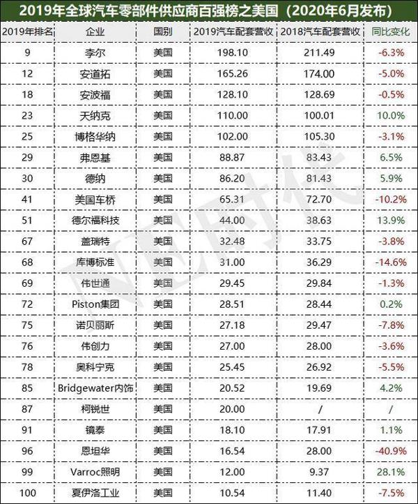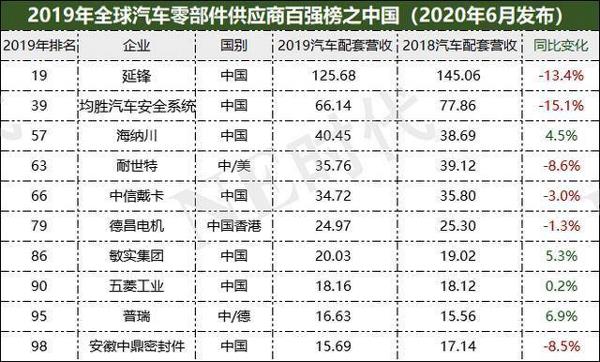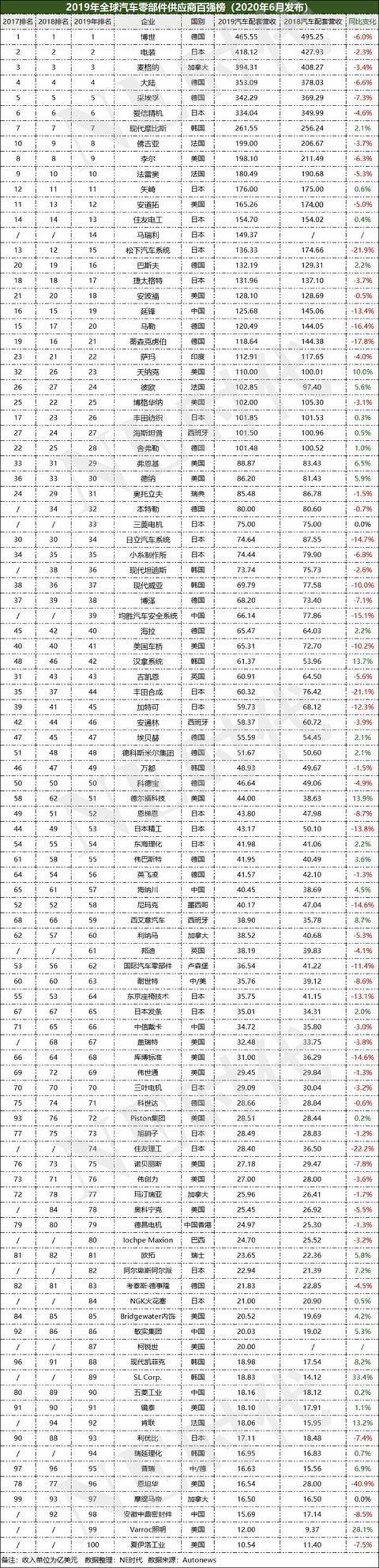 6月29日,Autonews根據2019年汽車配套營收統計出一份全球汽車零部件百強榜。 若看名次,雖有起落,但變化不大。與過去兩年一樣,博世、電裝、麥格納、大陸和采埃孚仍然是世界上最大的五家汽車零部件供應商。在前10名中,只有李爾和佛吉亞這兩家在去年改變了排名。它們交換了榜單上的位置,佛吉亞現在排名第8,李爾排名第9。 中國企業上榜的數量減少了一家,但也算發揮穩定。延鋒、均勝汽車安全系統、海納川、耐世特、中信戴卡、德昌電機、敏實集團、五菱工業、普瑞、安徽中鼎密封件均再次進入百強榜。