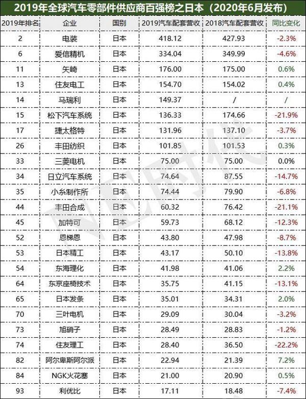 正式退出汽車零部件業務的還有霍尼韋爾。八年,霍尼韋爾或出售,或剝離旗下車載傳感器業務、汽車消費品業務、剎車片摩擦材料業務和渦輪增壓器業務。 被霍尼韋爾出售或剝離的業務,有兩個直接或間接地出現在百強榜中。一是蓋瑞特,渦輪增壓器企業(2019年汽車配套營收32.48億美元,排名第67),一是天納克,它將旗下排氣系統業務與輝門動力總成重組為一家動力總成系統公司,保留“天納克”的企業名,而輝門在2014年拿下霍尼韋爾剎車片摩擦材料業務。 兜兜轉轉不離汽車業的有恩坦華、德爾福科技和安波福。恩坦華離開德爾福的時間比較早,在2008年。德爾福科技和安波福的剝離則發生在三年前。 德爾福做了一個大動作,將動力總成分拆出去,取名德爾福科技,而將母體公司改名為Aptiv(安波福),專注于自動駕駛、數據、車聯網等前沿科技業務。若說德爾福科技是為整車提供“心臟”,安波福即是“神經”和“大腦”。 到今年年初,德爾福的動力“心臟”被博格華納宣布合并。前者的44億美元汽車配套營收,加上博格華納102億美元的營收,構成一家146億美元專注于動力總成的企業。這家新企業在今年百強榜中可以排到第15名。 美國不止零部件企業在分拆旗下汽車業務,整車集團亦是。去年5月,FCA宣布將馬瑞利以58億歐元的價格出售給日本康奈可。合并后的實體以馬瑞利CK控股的名字運營,今年排名第14,作為對比2019年發布的百強榜康奈可排名第32。 自己出售零部件公司不說,FCA勸合并對象PSA也將旗下零部件供應商佛吉亞出售出去。這家全球第八大汽車零部件供應商不知會被出售還是剝離? 日系的“整合” 日系整車和零部件企業大概是最團結一致的。出于對未來供應鏈的把控,他們選擇的方案是,結成更為緊密的研發、銷售體系。這是一份從資本到技術的團結。 在公布2019財年業績報告的同時,愛信精機召開董事會,決定從2021年4月1日起,將公司更名為愛信,且屆時愛信精機與愛信AW將完成合并,以新公司名迎接新的開始。