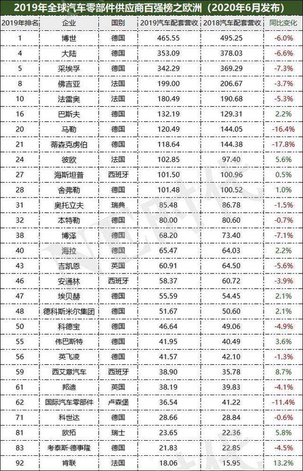 吸收傳統零部件業務,對于不夠成熟的自主供應鏈更多是好處。面對新能源汽車的未來,國內出現了一批電池、電機電控,乃至功率器件企業,擁有可與海外競爭的資本和產品。但在盤子足夠大的燃油車市場,自主零部件始終在動力總成與汽車電子等上面與外資存在較大的差距。 追上這段空白,需要國內零部件企業和整車廠費錢費時間,才能拿到足夠的經驗值。若有錢能夠收購一些外資當掉的資產,對國內經驗值的積累想必是有好處的。 在艱難的歲月里,處在轉型期的企業和個人,會不由自主地兩難。無論是拆分、整合、收購,這些零部件企業面向未來都邁出了關鍵的一步。但愿堅決的它們永不消失在百強榜。 附件:2020年全球汽車零部件百強榜