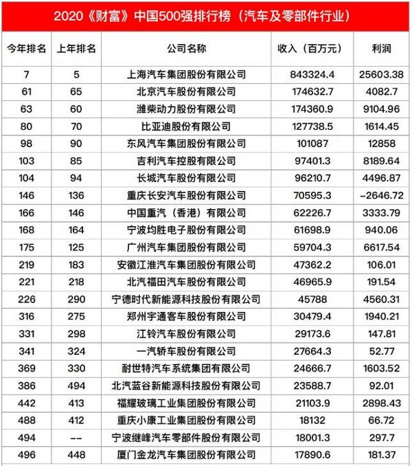 2020《財富》中國500強汽車及零部件入圍榜單!