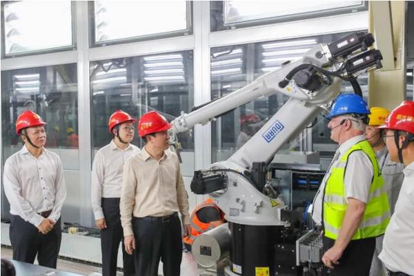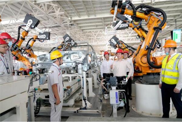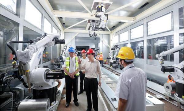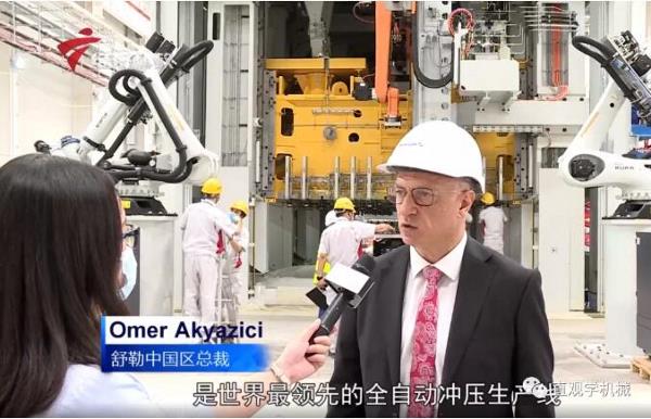 舒勒中國區總裁介紹這條沖壓線 車身車間采用德國庫卡和日本發那科裝備,運用數字化雙胞胎技術,生產數據跨車間協同,又是一家“黑燈工廠”。