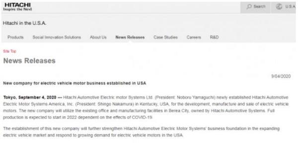 近日,日立公司(HITACHI)在官網(wǎng)發(fā)布聲明,稱公司在美國(guó)肯塔基州新成立了日立汽車電機(jī)系統(tǒng)美國(guó)有限公司,進(jìn)入電動(dòng)汽車的電機(jī)市場(chǎng),預(yù)計(jì)2022年全面投產(chǎn),并任命中村慎吾為分公司總裁。 新成立的公司用于開發(fā)、制造和銷售電動(dòng)汽車的電機(jī),將利用日立汽車在美的部分工廠及寫字樓進(jìn)行日常生產(chǎn)和辦公,該公司占地約26萬平方米,地點(diǎn)在美國(guó)肯塔基州波利亞,為日立下屬汽車公司(日立汽車電機(jī)系統(tǒng)有限公司)的子公司。