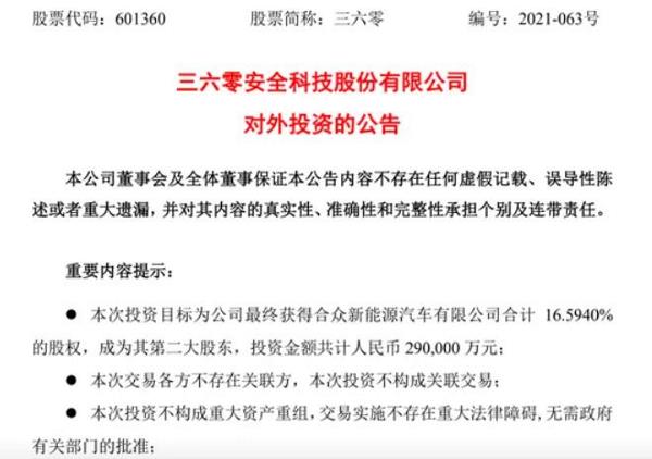 10月18日晚間,三六零安全科技股份有限公司(601360)(以下簡稱“三六零”)公告稱,擬以自有資金共計人民幣29億元投資入股合眾新能源汽車有限公司(以下簡稱“哪吒汽車”),投資全部完成后,公司將間接合計持有哪吒汽車16.5940%股權,合計成為哪吒汽車第二大股東,但本次交易不會導致公司的合并報表范圍發生變化。