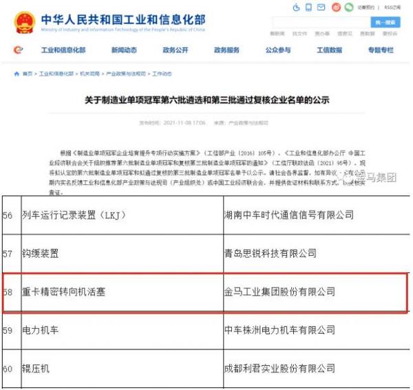 近日,工業和信息化部公示了第六批制造業單項冠軍名單,金馬工業集團憑借產品重卡精密轉向機活塞成功入榜。這是繼本年度獲得“國家質量標桿”、“國家專精特新小巨人”后的又一項國家級榮譽。