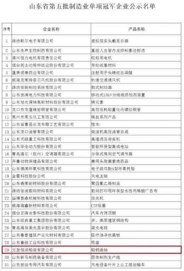 11月16日,山東省工信廳發布《第五批山東省制造業單項冠軍名單公示》,文登恒潤鍛造有限公司憑借“鍛鋼曲軸”產品成功入圍。