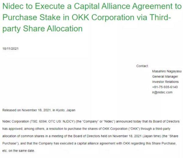 <Nidec官網截圖> 近日,日本電產又有新動作,其將于2022 年1月收購歷史悠久的日本機床制造商OKK。據了解,日本電產將投入54億日元,出資比例達到約67%,到2022年1月,OKK將正式成為電產子公司。