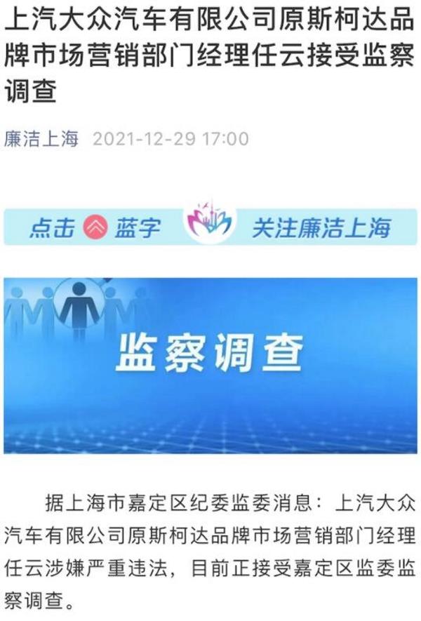 據“廉潔上海”12月29日發布消息,上汽大眾汽車有限公司原斯柯達品牌市場營銷部門經理任云涉嫌嚴重違法,目前正接受嘉定區監委監察調查。這已是三個月內上汽斯柯達第二起高管涉嫌違法被查事件。