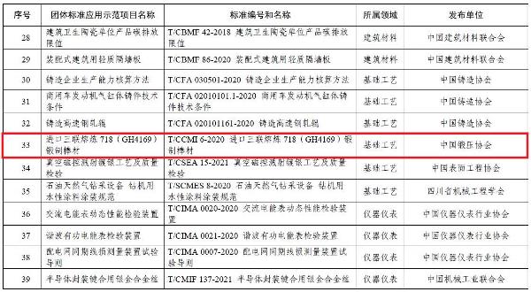 2021年12月30日,工業和信息化部公布111項2021年團體標準應用示范項目,中國鍛壓協會發布的T/CCMI 6-2020《進口三聯熔煉718(GH4169)鍛制棒材》團體標準成功入選。