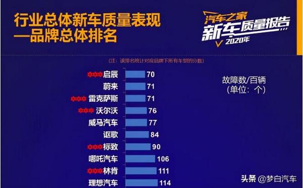 首先,來看下我們國產車的上榜情況,近幾年國產車的提升比較明顯,相信大家對此也是有目共睹,此次上榜的34個品牌當中,國產車品牌占了15個,整體表現可以說是十分亮眼。其中,啟辰汽車和蔚來汽車更是包攬了前二,占了表現比雷克薩斯還要出色,而威馬汽車、哪吒汽車和理想汽車也都是入榜前十,如此來看,排名前十的汽車品牌,我們國產車占了一半。